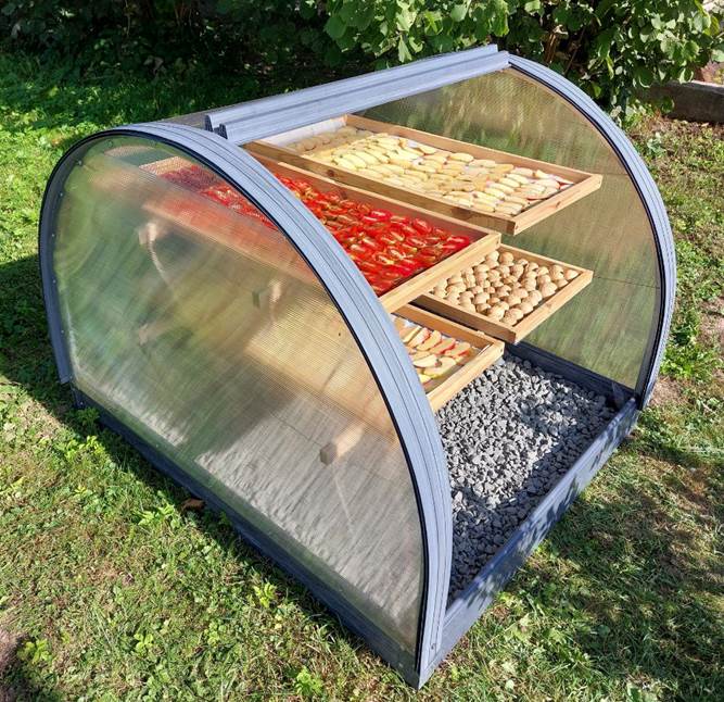 В солнечную погоду воздух внутри сушильной камеры прогревается до температуры, на 15-25 градусов выше температуры наружного воздуха и длительное время остается теплым после захода солнца. Такая сушильная камера с успехом может применяться для сушки и вяления овощей, фруктов, ягод, орехов, грибов и рыбы.